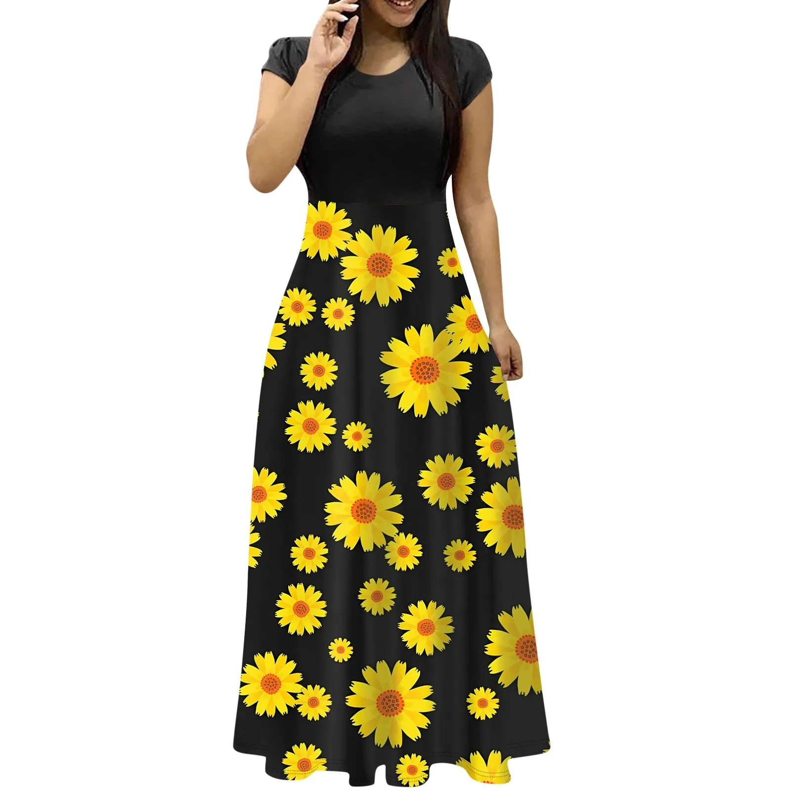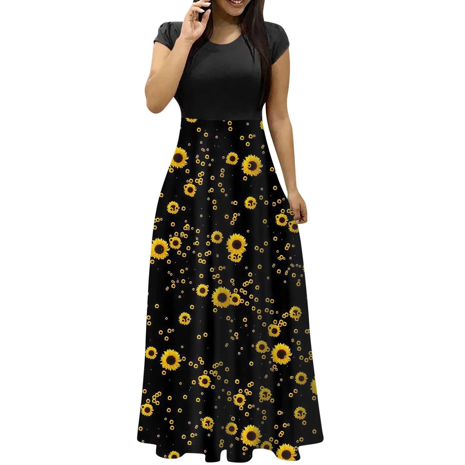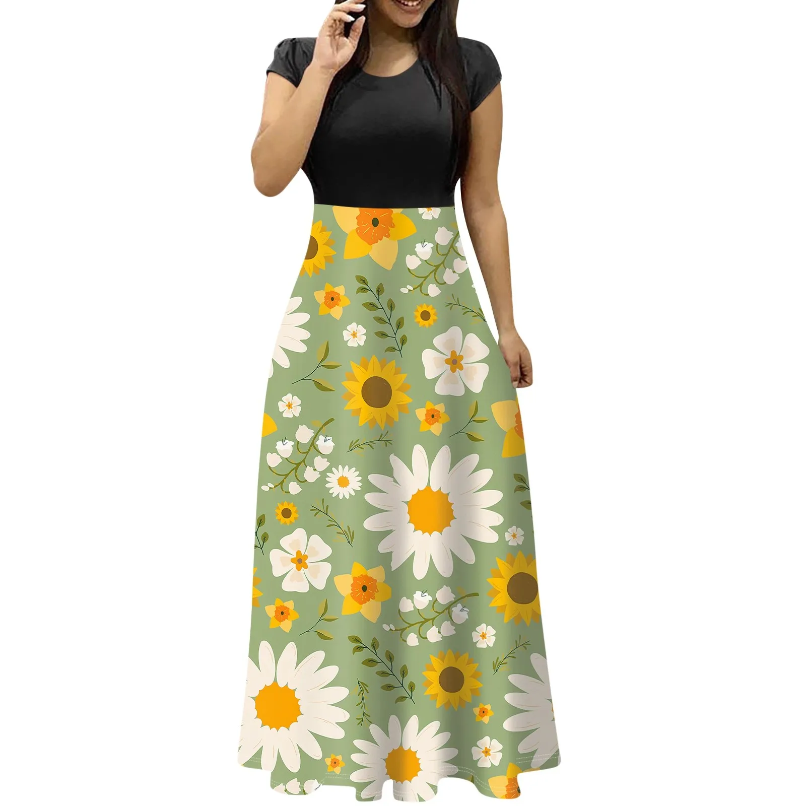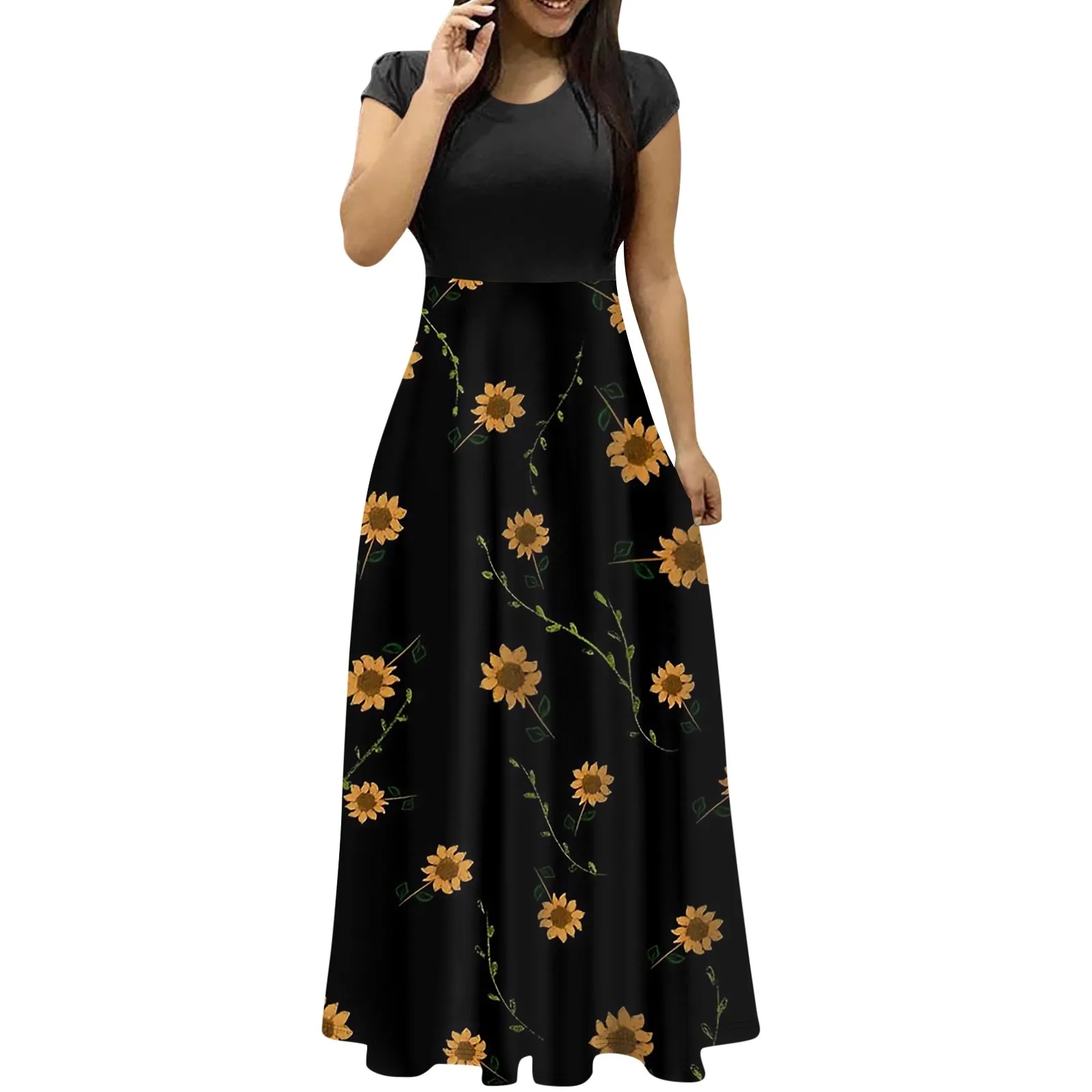 elegant dresses for women Fashion Casual long dresses Print O-Neck Short Sleeves Oversized Maxi Dress Splicing vestidos curtos