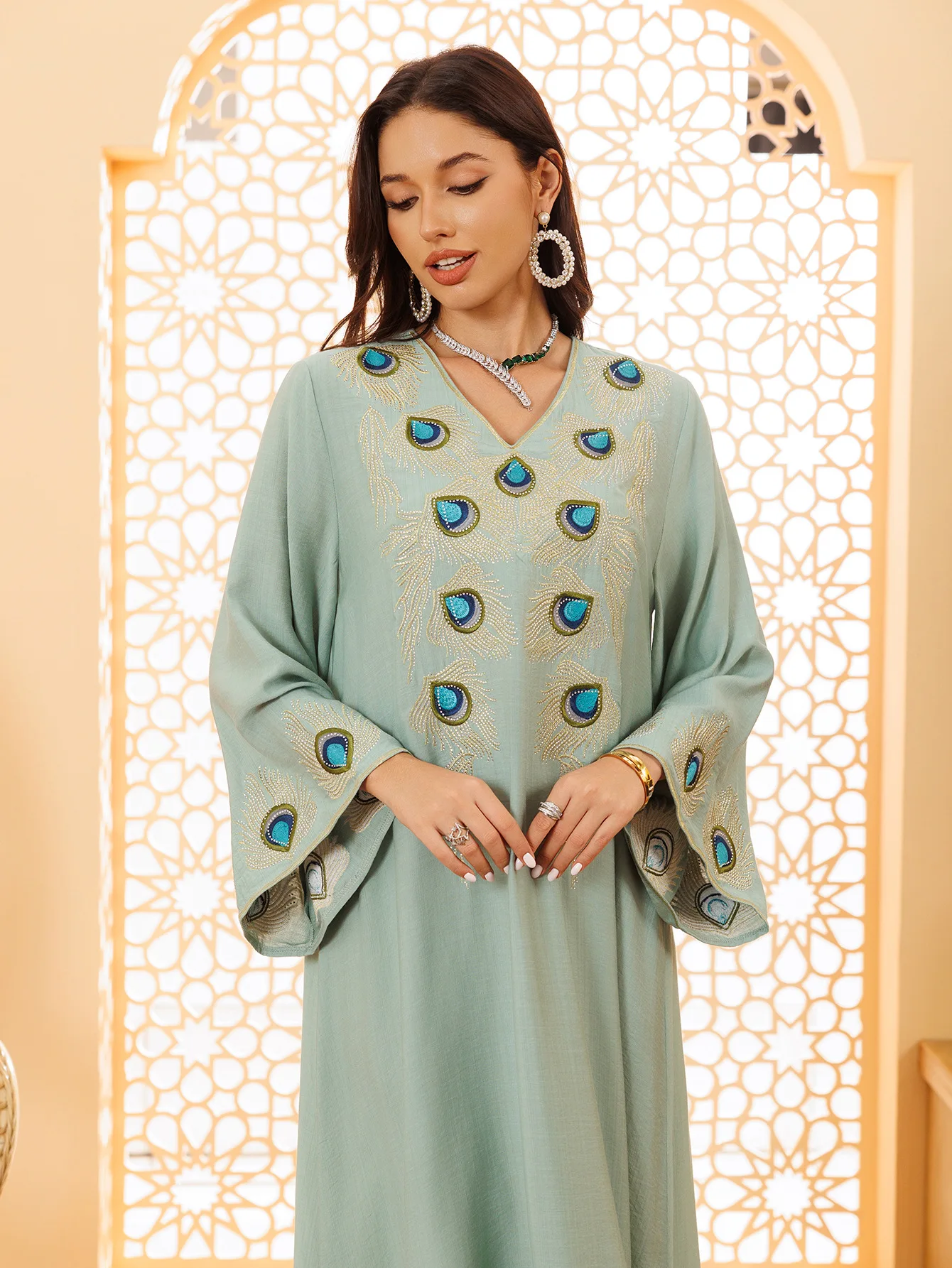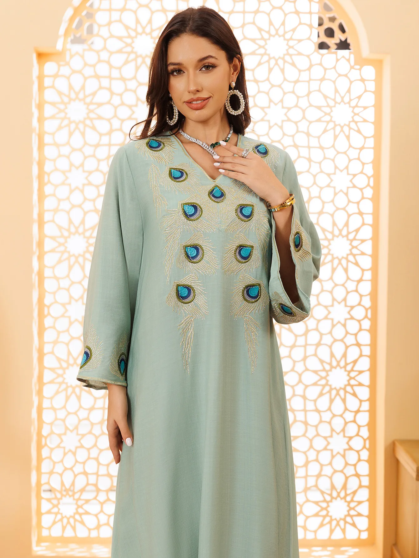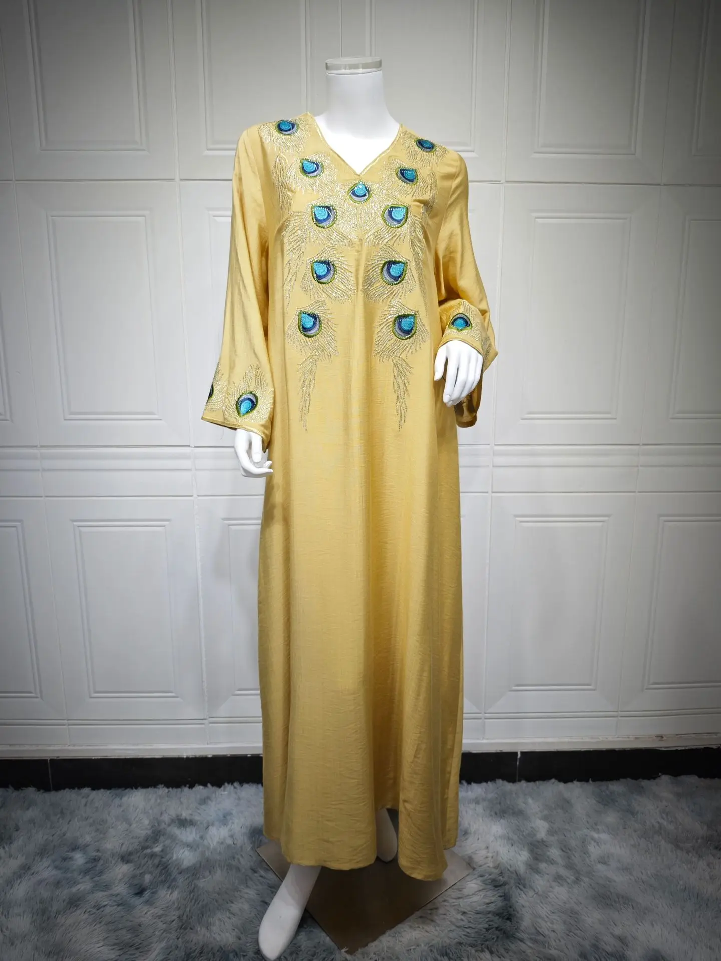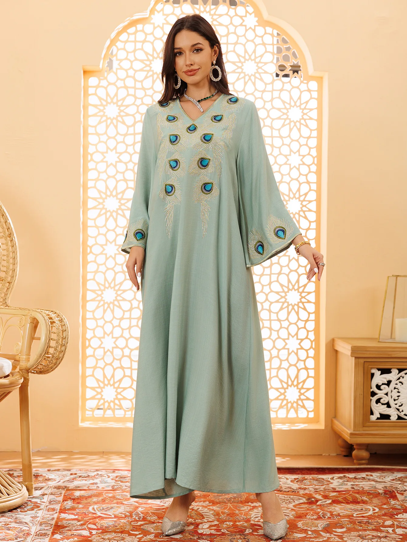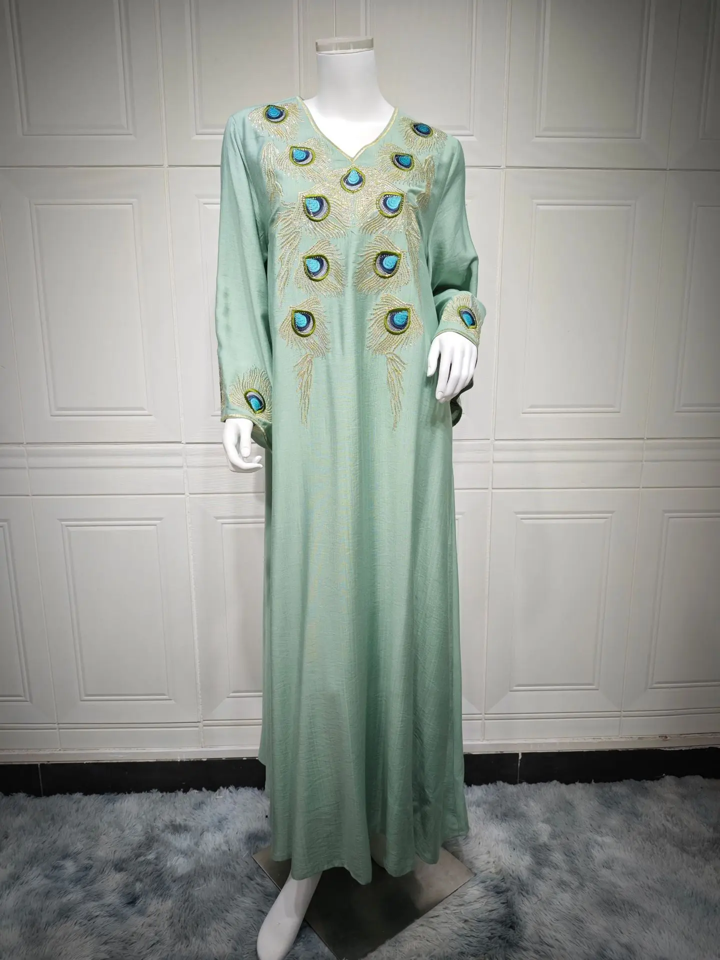 Elegant Women Evening Dress Solid V-Neck abaya Long Sleeve
