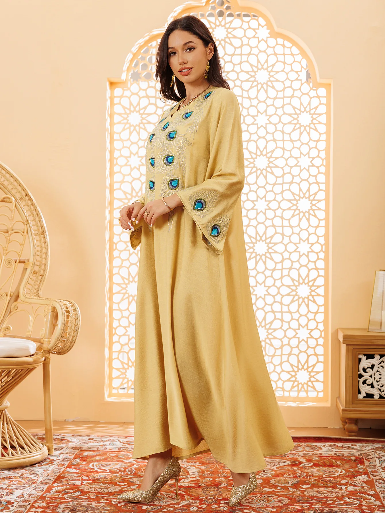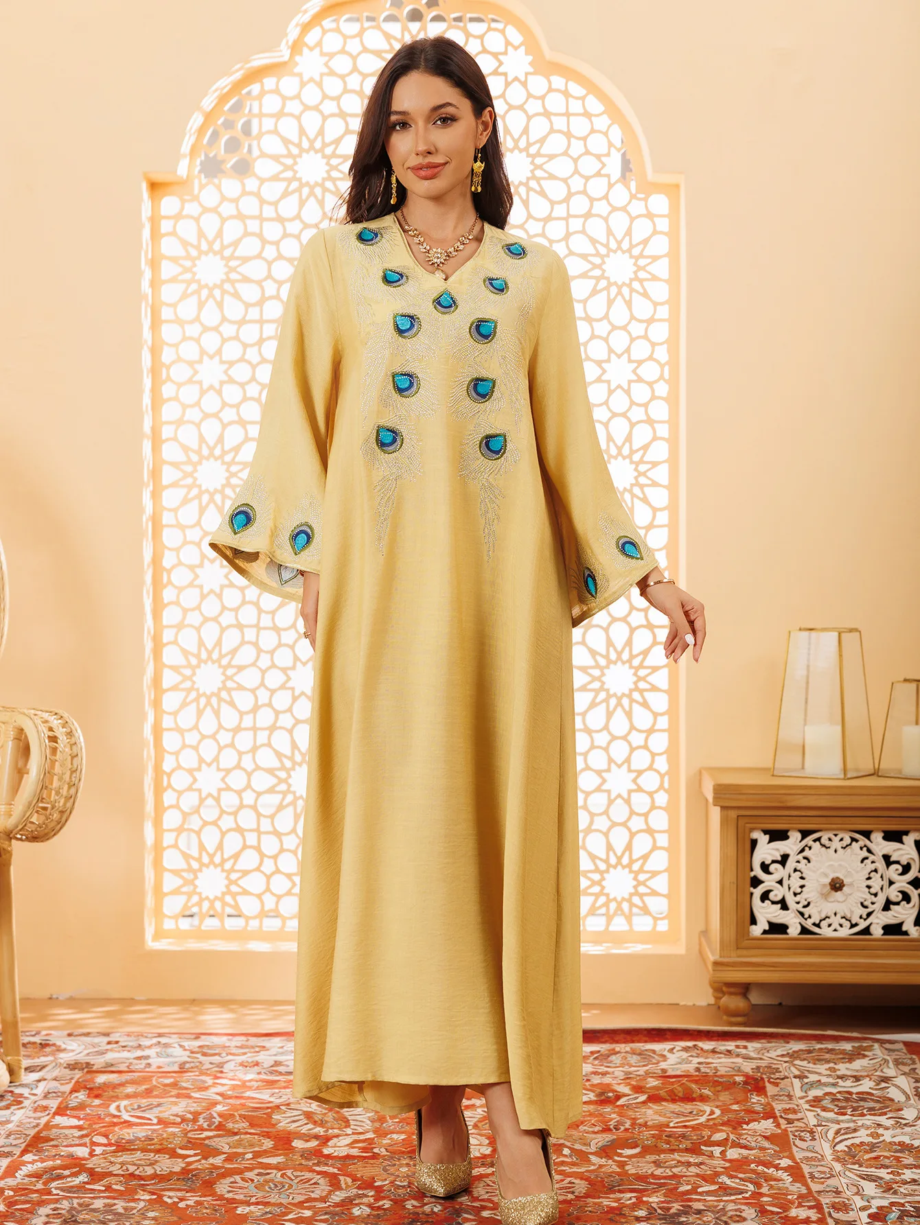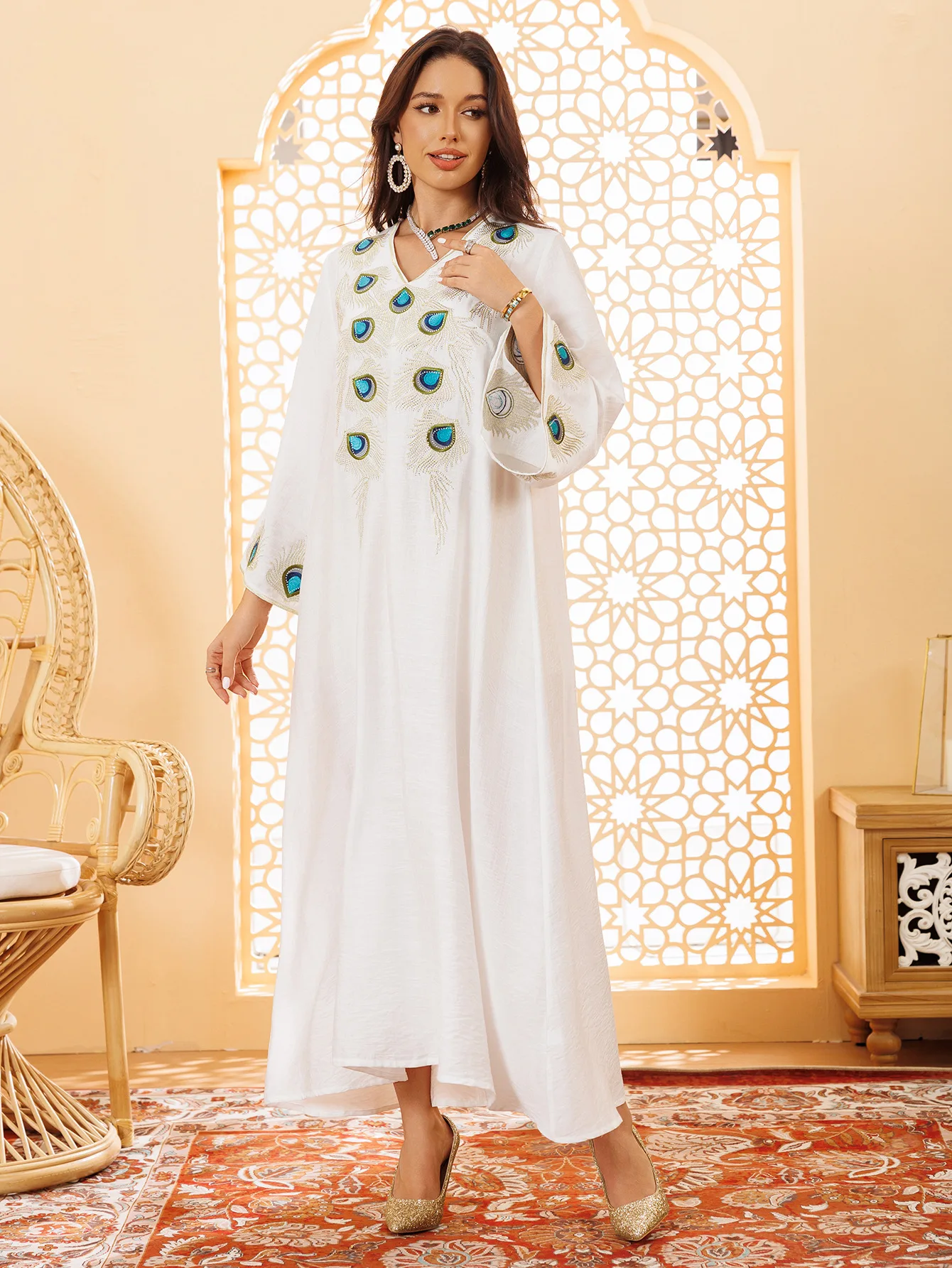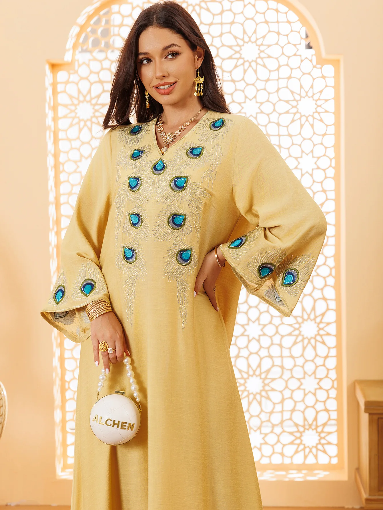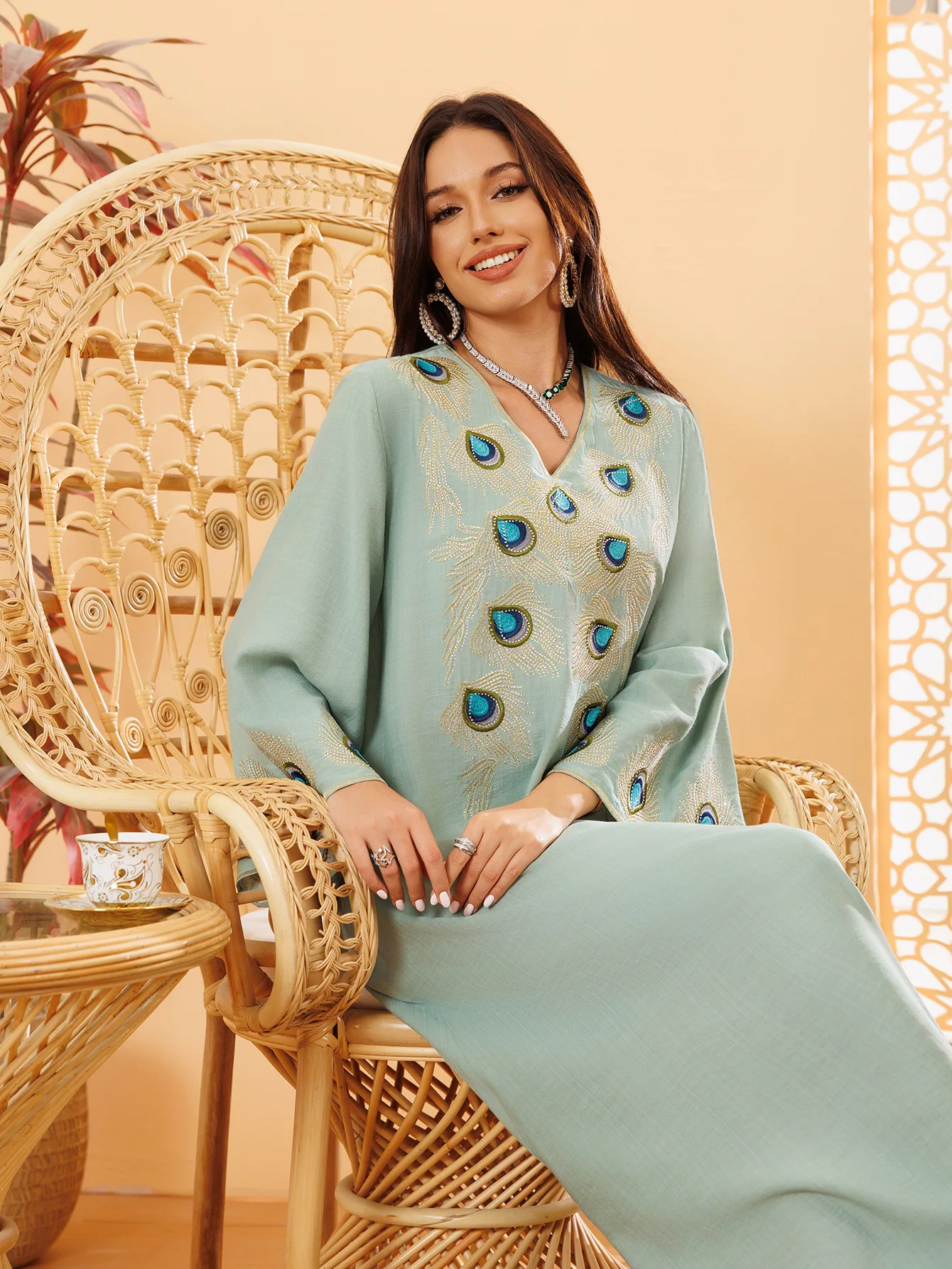 Elegant Women Evening Dress Solid V-Neck abaya Long Sleeve