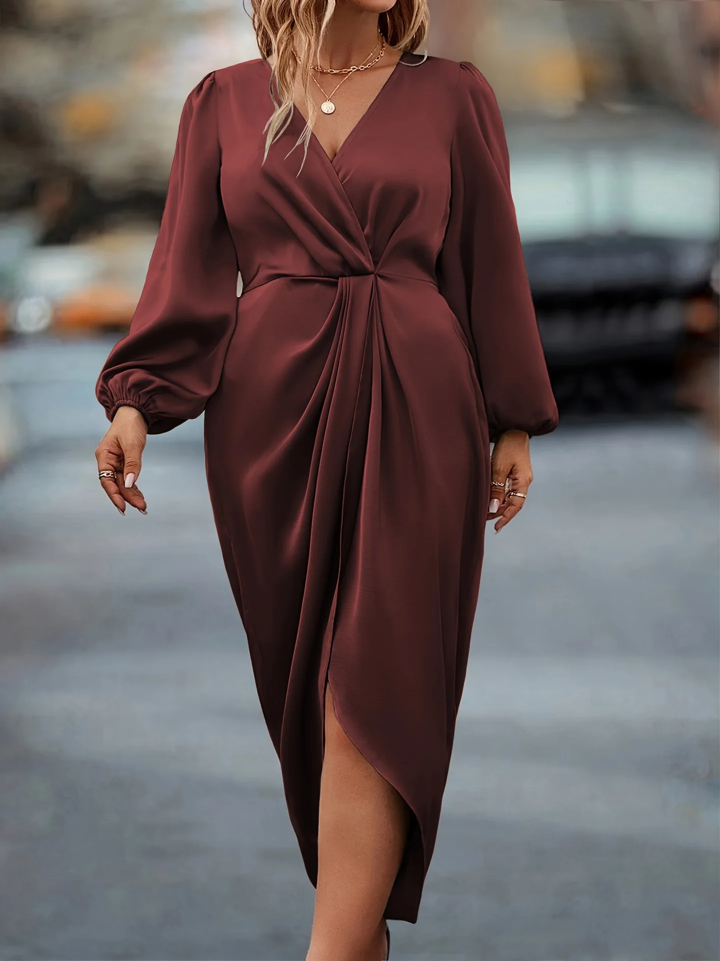 Women's Satin Evening Party Maxi Dress Draped Silk V-Neck Long Sleeve Office Lady Midi Dresses Vestidos Sexy Chic Robes Longue
