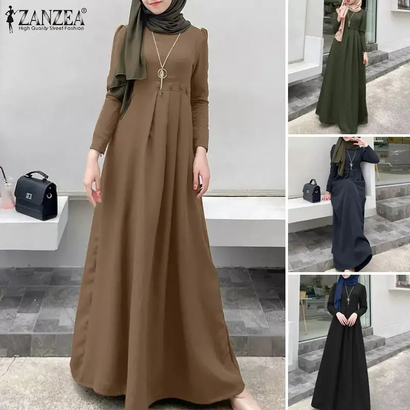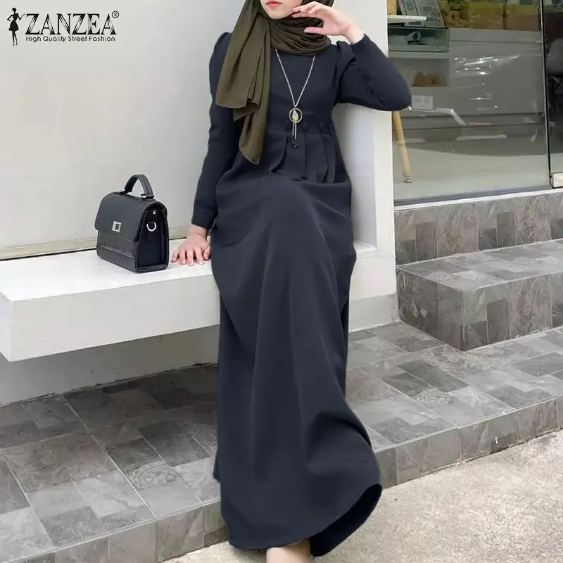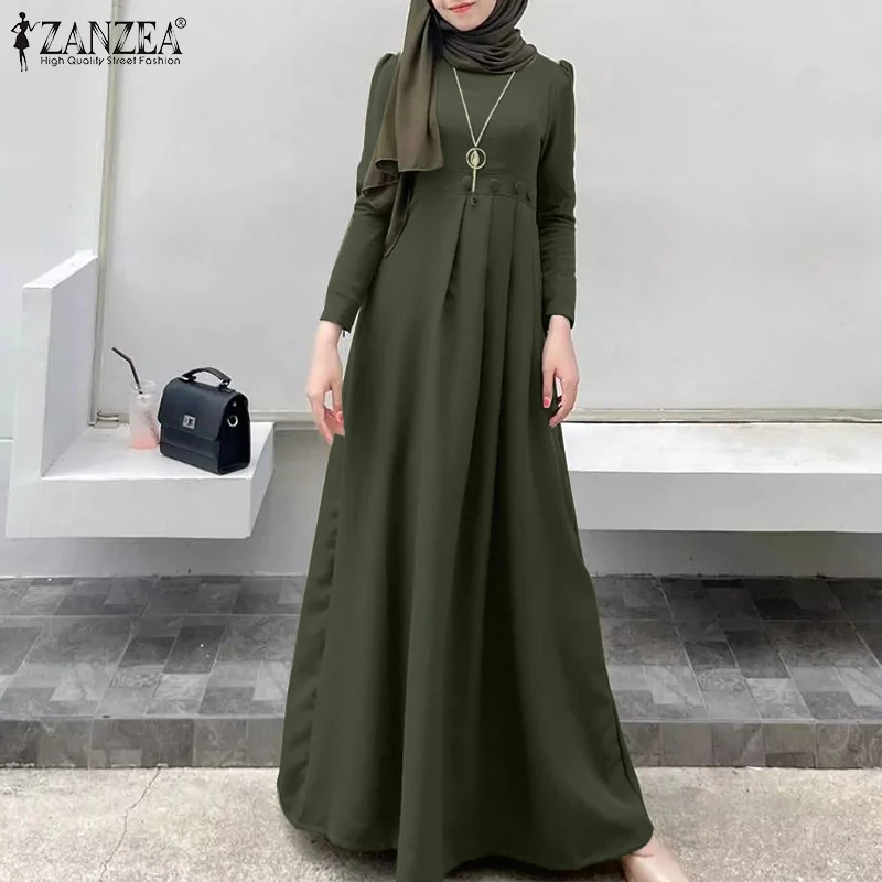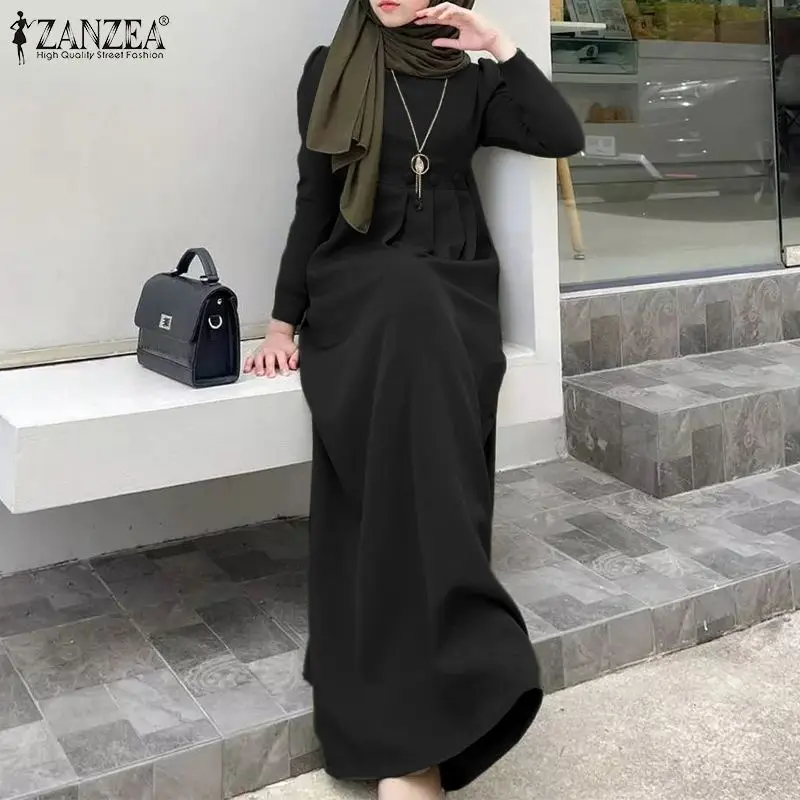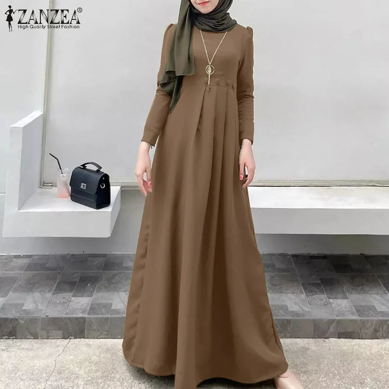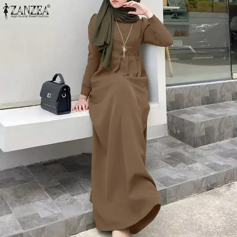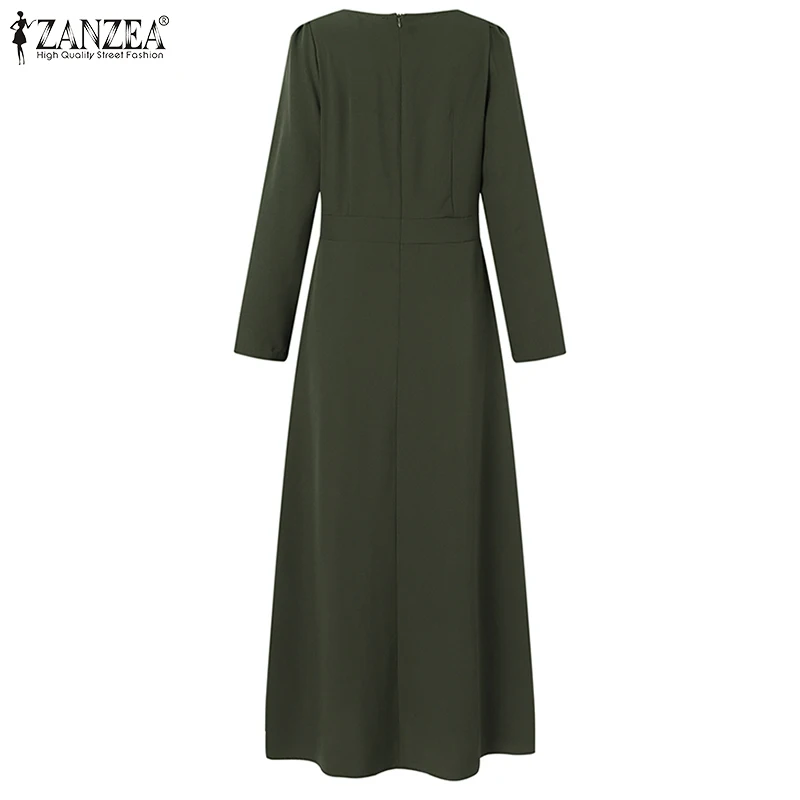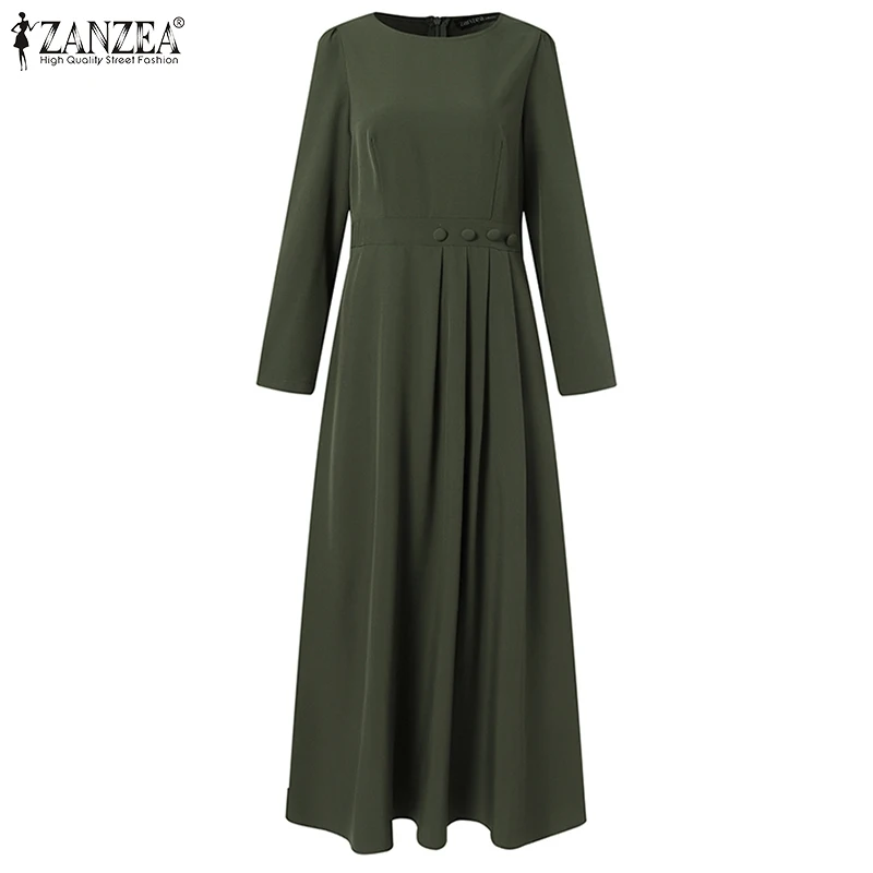 ZANZEA Women's Long Dress Spring Full Sleeve O-Neck Solid Sundress Casual Loose Elegant Robe